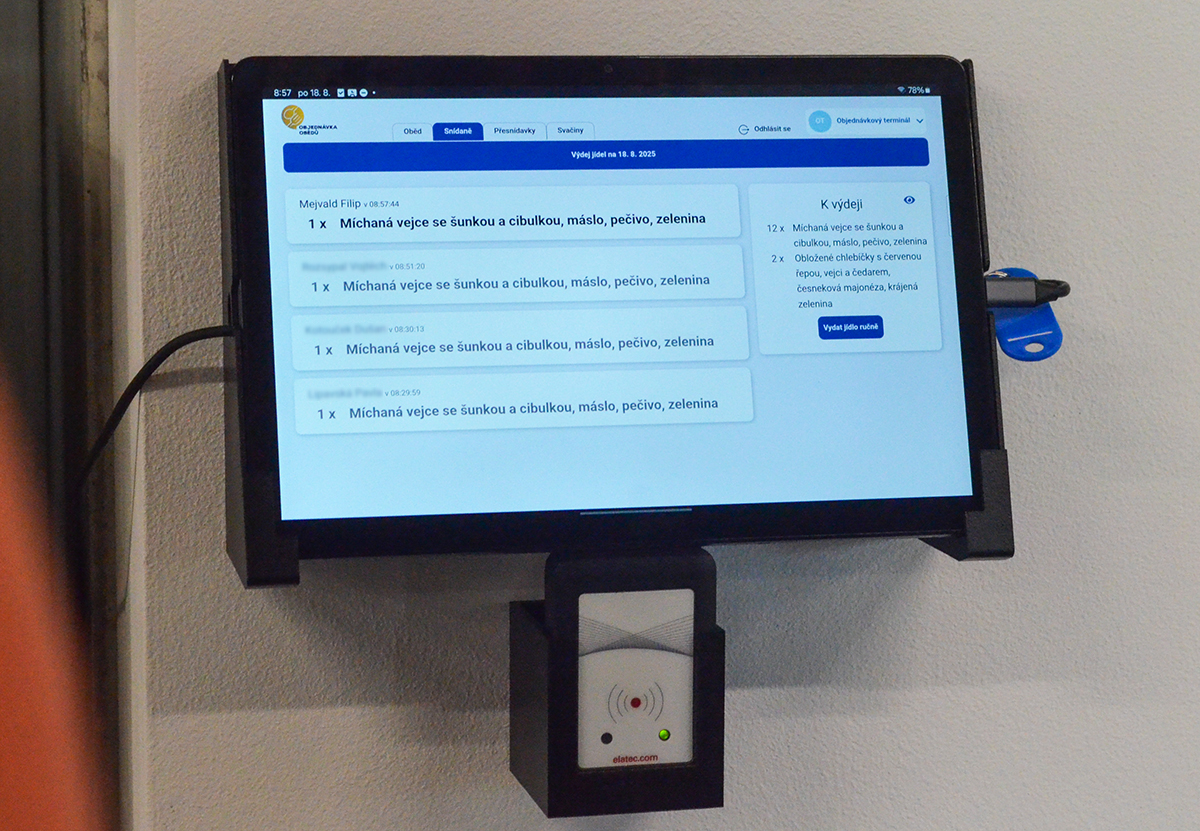 Na terminálu jsou objednávky pro aktuální den. Uživatel přijde a přiloží kartu/čip/QR kód ke čtečce – obsluha okamžitě vidí, jaké jídlo má vydat.